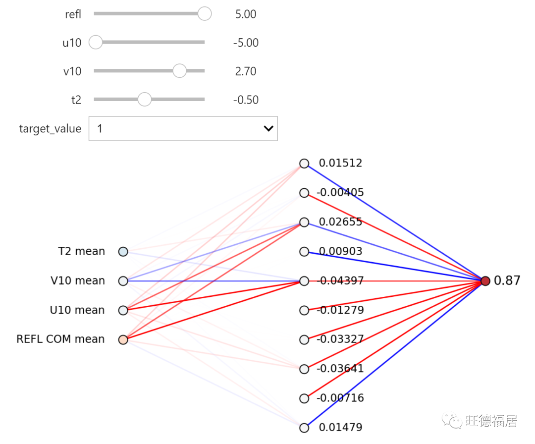 当一组输入通过网络时,我们还可以绘制神经网络权重和值的梯度。将目标值从 0 更改为 1 时,梯度如何变化?改变每个输入字段如何影响整个网络的梯度?
