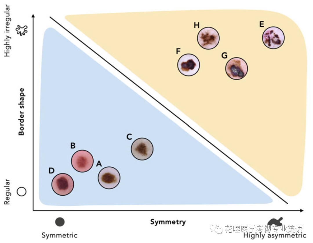 图1.4 模型训练包含了找到一条合适的直线,将特征空间中的两类数据分开。图中线性分类器的黑色直线提供了区分良性和恶性病变的计算规则。如果病变的特征位于直线下方(在蓝色区域),则归类为良性病变,位于其上方(在黄色区域),则归类为恶性病变