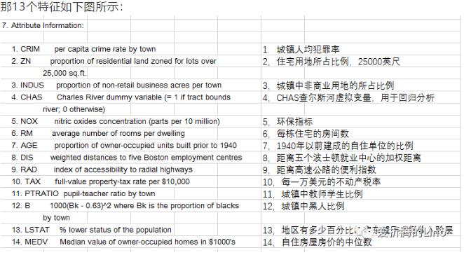 上图中dataframe,除了PRICE那一列为房价之外,其余的全是特征,共13个,释义如下: