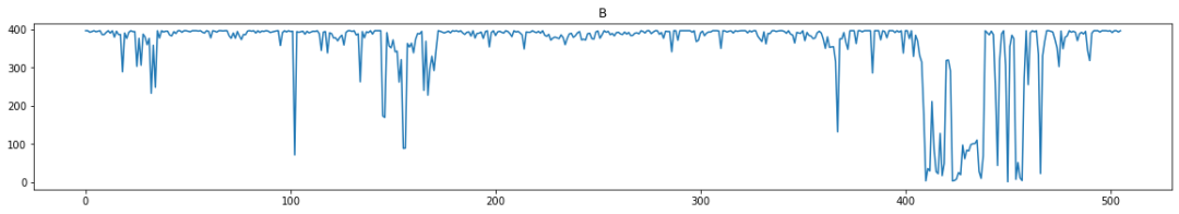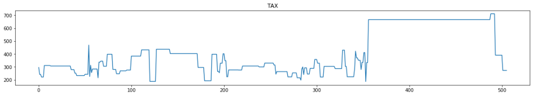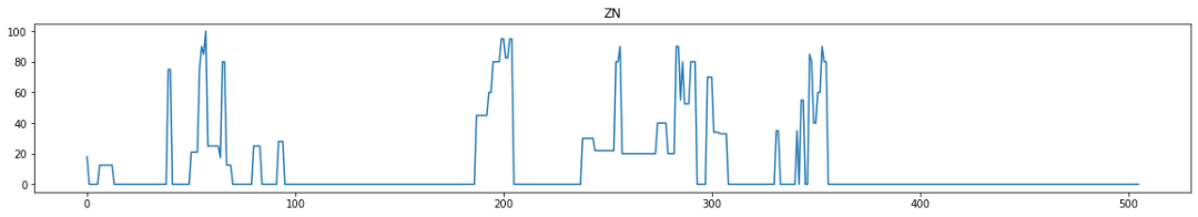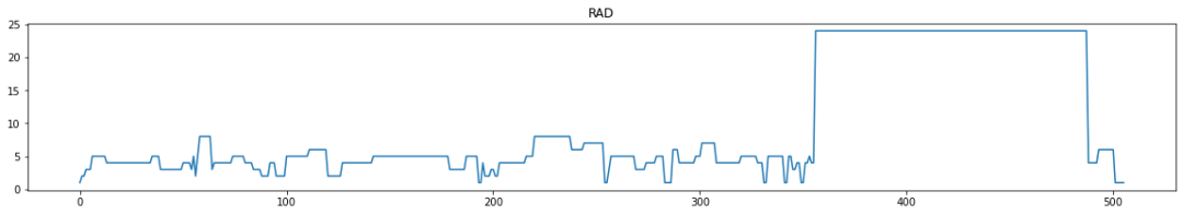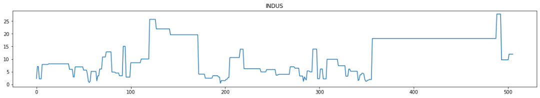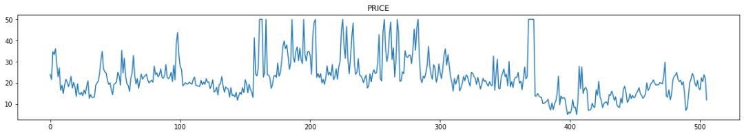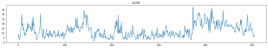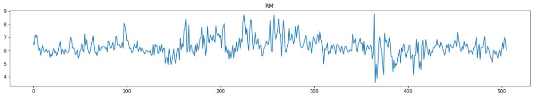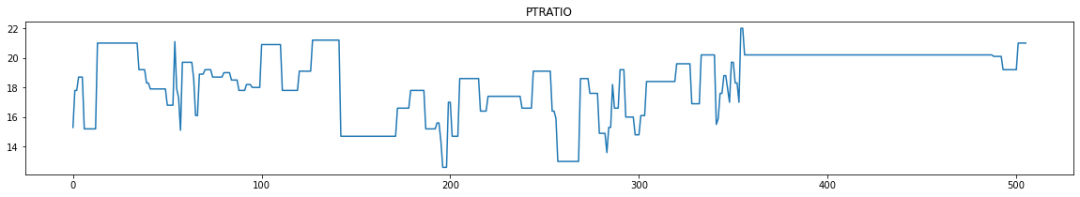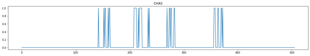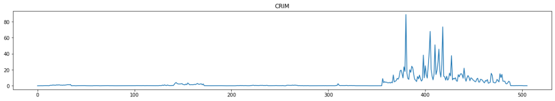 for i in range(0,boston_df.shape[1]):plt.figure(figsize=(20,3))plt.title(boston_df.columns[i])plt.plot(boston_df[boston_df.columns[i]])plt.show()