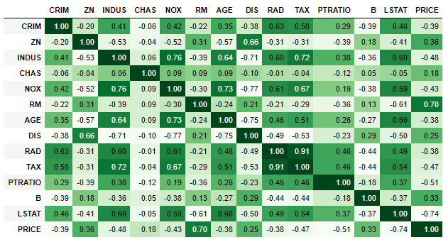 corr = boston_df.corr()corr.style.background_gradient(cmap='Greens').set_precision(2)