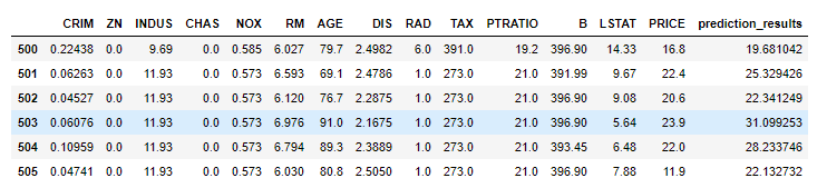 train_df = boston_df[:500].copy()# 测试集就6条数据,先看看效果咋样test_df = boston_df[500:].copy()