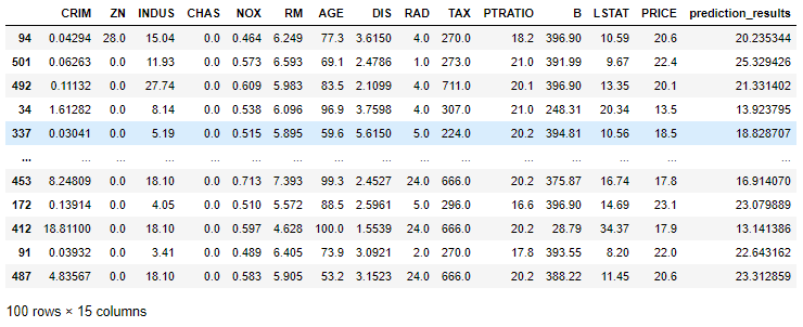 big_test_df = boston_df.sample(100)big_test_prediction_df = fcn.predict(big_test_df,prediction_type='dataframe')big_test_prediction_df