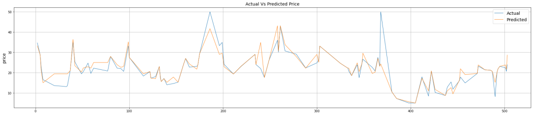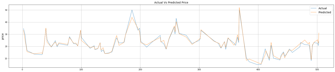 ml_plot_df = ml_big_test_prediction_df.sort_index(plt.figure(figsize=(30,6))plt.plot(ml_plot_df['PRICE'], linewidth=1, label= 'Actual')plt.plot(ml_plot_df['prediction_results'], linewidth=1, label= 'Predicted')plt.ylabel('price', fontsize=14)plt.legend(fontsize=14,loc='upper right')plt.title('Actual Vs Predicted Price', fontsize=14)plt.grid()plt.show()