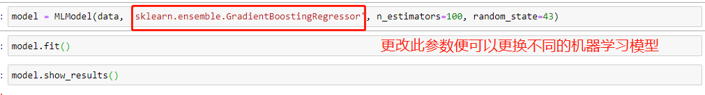 在第二个参数model_type之后可以填上模型对应的一些参数,比如上图中的n_estimators=100, random_state=43都是模型:sklearn.ensemble.GradientBoostingRegressor中的参数。如果不知道怎么设定参数的话,可以不填使用默认值就好。
