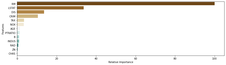 feature_imp_RF = model.feature_importances_rel_feature_imp = 100 * (feature_imp_RF / max(feature_imp_RF))rel_feature_imp = pd.DataFrame({'features':list(X), 'rel_importance':rel_feature_imp })rel_feature_imp = rel_feature_imp.sort_values('rel_importance', ascending=False)plt.figure(figsize=[15,4])plt.yticks(fontsize=10)ax = sns.barplot(x="rel_importance", y="features", data=rel_feature_imp, palette="BrBG")plt.xlabel("Relative Importance", fontsize=10)plt.ylabel("Features", fontsize=10)plt.show()