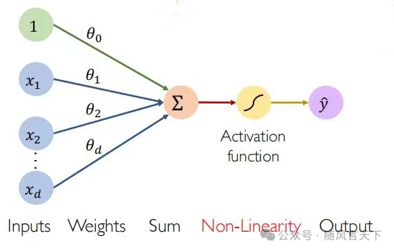 基于生物神经元模型可得到感知机的基本结构,即输入、权重、求和、激活函数以及最后的输出。图2展示了一个上述内容。需要指出的是,图2中的Weights(权重)需要通过感知机学习算法来进行确定,该算法在后文中会提到。