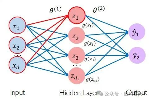 从图7的多层感知机我们可以发现,其包含输入层(Input)、隐藏层(Hidden Layer)以及输出层(Output)。同时,需要指出的是,该网络结构包含两层,初学者易将其误认为三层。并且,第一层包含d1个神经元,第二次包含2个神经元。