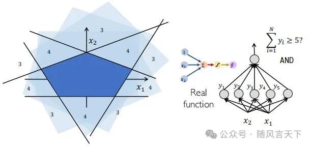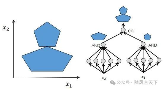 使用五个感知机,组成多层感知机,可表示一个五边形。
