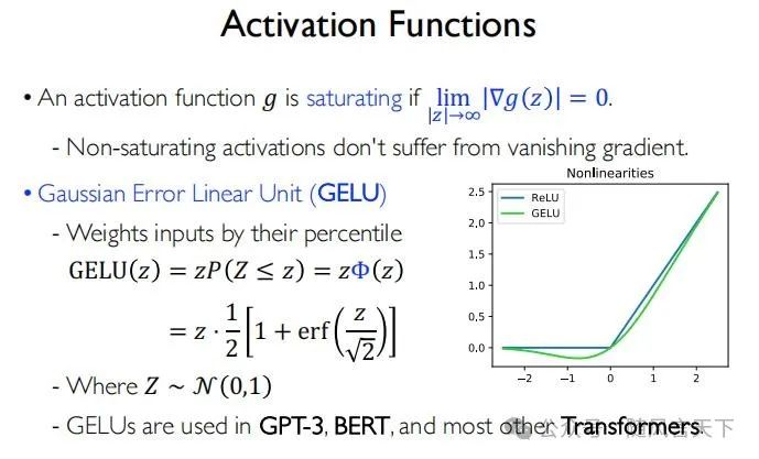GELU函数目前大量被使用在大语言模型中,如GPT-3、BERT以及其他基于Transformer开发的大语言模型中。需要指出的是,以上提到的激活函数都是被应用于MLP的隐藏层中。