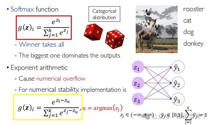 可以看到,图17中红框所示即为Softmax函数的表达式,其将属于实数集R的z映射为属于[0,1]的概率分布y。其两个特点分别是:(1)赢者通吃;(2)数值最大者决定最终的输出值。但是在实际使用中,容易出现数值溢出的情况(numerical overflow),于是人们分子分母同时除以一个函数,如图17黄框所示。图18具体解析了Softmax函数表达式,读者可仔细阅读。