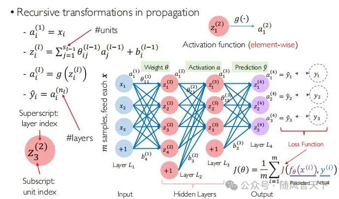 首先,我们进行一些基本的定义,如图21所示。简而言之,就是用上标表示层号,用下标表示神经元的序号。