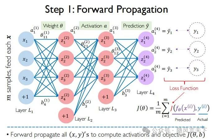 由于最初θ是未知的,故可先假设一个θ。前向传播可计算出所有的x、y、z以及a