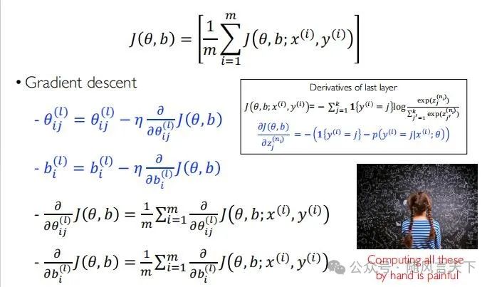 对于损失函数(Loss Fuction),J中包含两部分,fθ(x(i))代表感知机输出的预测值,y(i)代表真实标签,每一项二者作差,在m个样本上加起来再取平均就得到了最后的J(θ)。