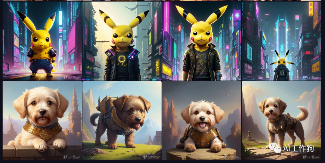 然后本狗选择了专业版的生成,再次生成"赛博朋克的皮卡丘",这些出来的图本狗觉得还算可以,但是不会给本狗一种很惊艳的感觉,有兴趣的小伙伴可以尝试以下!