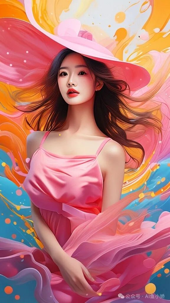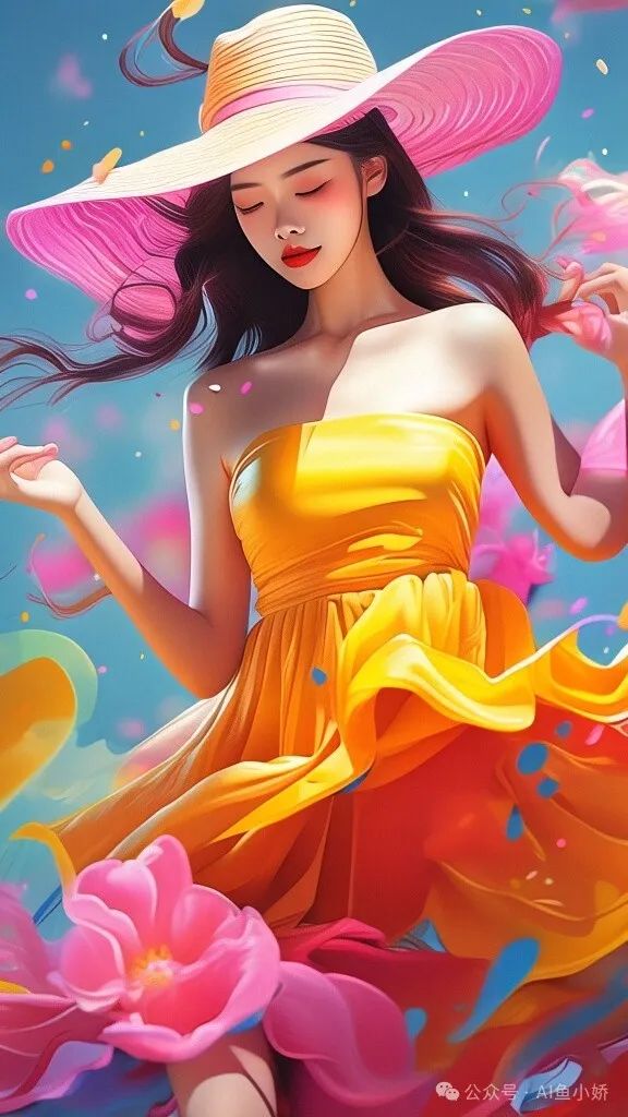 提示词:生成一幅充满活力和动感的插画。画面中央是一位身穿粉色服装的女性角色,她戴着帽子,头发飘逸,正在做着一个舞蹈动作。角色周围环绕着粉色和黄色的液体飞溅效果,这些色彩鲜艳的颜料仿佛被瞬间冻结在空中。背景部分模糊不清,只隐约可见一些建筑轮廓。