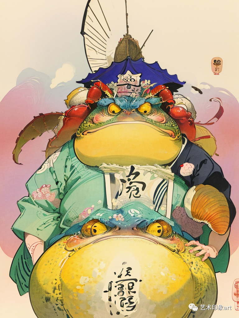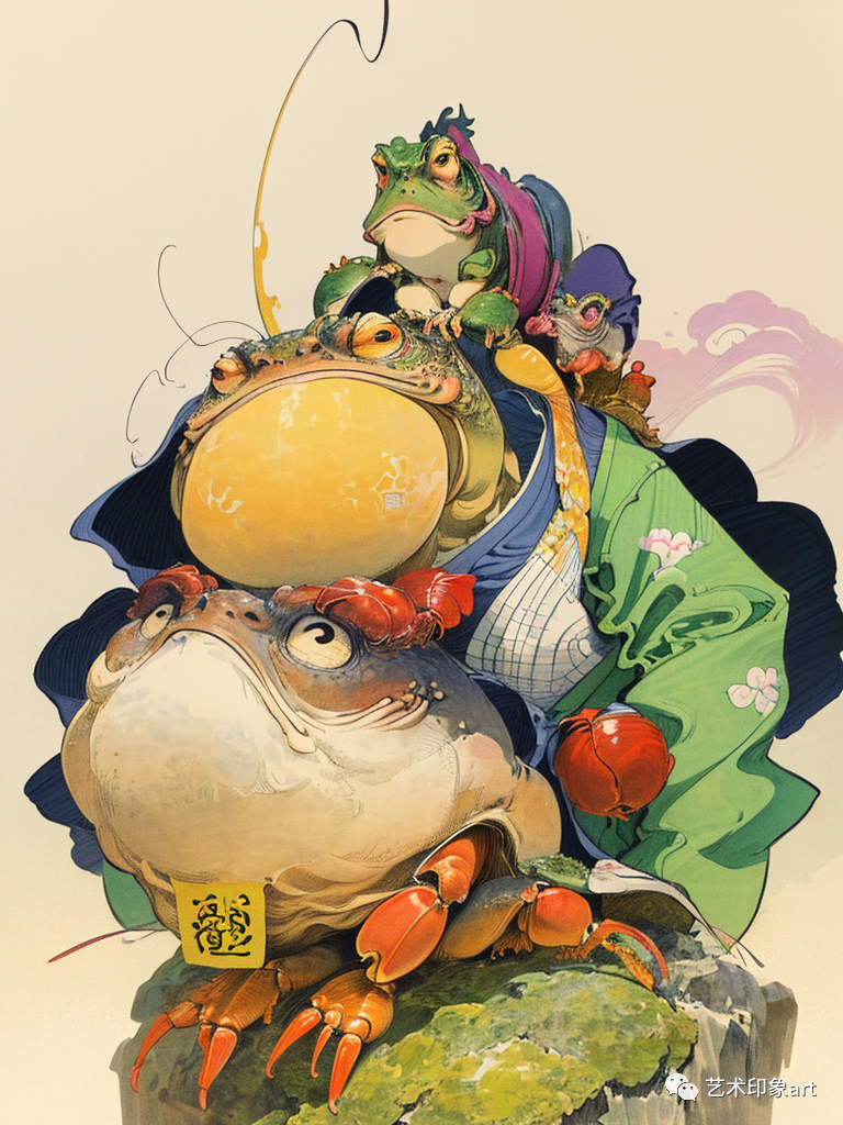 在这类AI生成的幻想插画中,我们看到了一个个奇幻的世界。其中,大乌龟、大金蛙、两只鸟等动物形象的出现,给人们带来了强烈的视觉冲击。这些动物形象不仅具有鲜明的个性和特点,还被赋予了丰富的情感和内涵。通过动物的形象,AI插画传达了一个个深邃的思考和感悟。