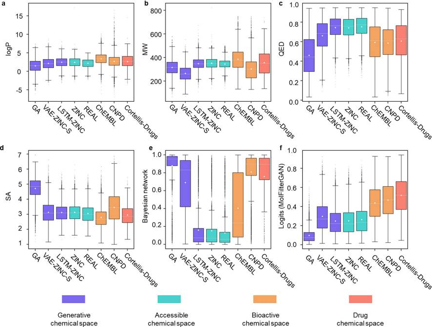 为了比较现有的分子筛选度量标准,作者准备了八个不同的数据集,以代表AI设计分子、可合成分子、生物活性分子和已批准药物的化学空间。具体来说,从三种生成方模型中分别采样1万个分子:基于图的遗传算法(GA)、使用经过过滤的ZINC数据库训练的GENTRL(VAE-ZINC-S)和使用ZINC数据库训练的LSTM模型(LSTM-ZINC)。从ZINC和REAL数据库中各抽样了1万个分子,以代表实际可得到的化学空间。此外,从ChEMBL和中国天然产物数据库中分别抽样了1万个分子,代表生物活性化学空间。最后,从Cortellis中收集了通过第三期临床试验的748个候选药物,以代表药物化学空间。