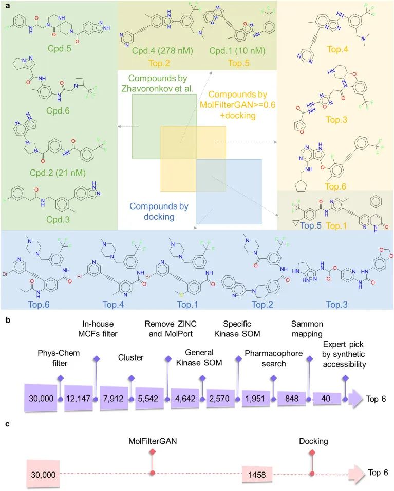 在先前的报道中,GENTRL模型生成了30,000种化合物中,通过各种内部过滤方法与专家的目视检查相结合,最终选出6种化合物用于后续合成和生物学评估。作者只使用了MolFilterGAN和传统的基于结构的对接对化合物进行过滤。如图5a所示,仅使用分子对接评分,这3种活性化合物中没有一种排名前6。当与MolFilterGAN相结合使用时,活性化合物cpd.1和cpd.4可以成功地排在前6位。结果表明MolFilterGAN可以作为一种有用的筛选方法用于从头设计分子。