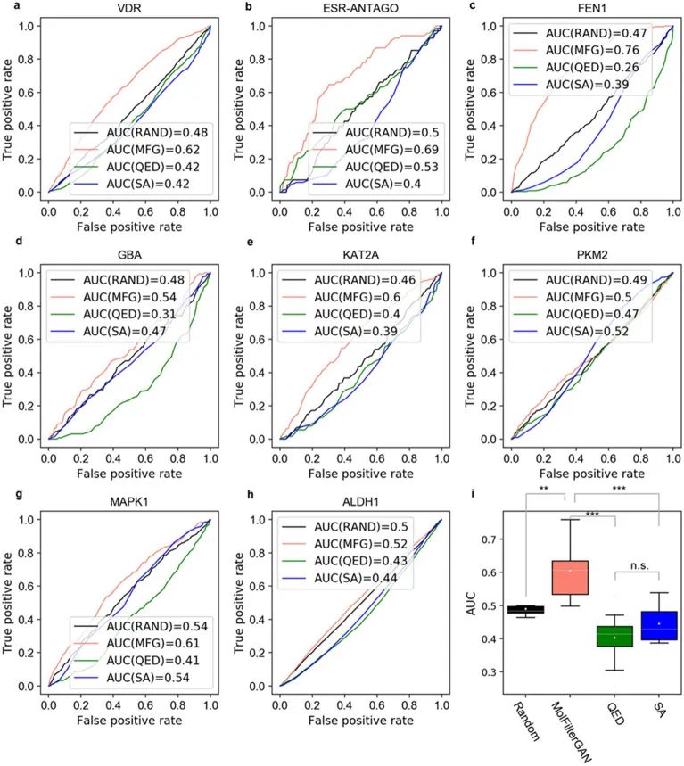 研究发现,大多数来自生物活性化学空间或药物化学空间的化合物符合RO5的规则,如图2a、b所示。但是RO5标准在其他基准集上表现不佳,因此在筛选候选药物时,RO5可能会出现过高的假阳性率。另外,作者发现QED的评分结果出现了误导性的趋势,其中ZINC和REAL分别获得了比ChEMBL、CNPD和Cortellis-Drugs更高的评分(如图2c、d所示),这意味着在一些商业化合物库用于药物筛选时,这些评价方法可能会适得其反。此外,BNN(AE+GCNN)能够很好地区分药物化学空间和可合成的化学空间,在生物活性库(ChEMBL、CNPD)的评分分布也符合预期(如图2e所示)。但是,当将其应用于过滤生成模型生成的分子时,BNN在生成库GA和VAE-ZINC-S也获得了高分,这意味着它可能有助于HTS或vHTS,但在过滤生成模型得到的分子时,可能会出现高误报率。如图2e,MolFilterGAN模型在不同化学空间的基准数据集上表现出色,能够很好地区分药物或生物活性分子和可合成分子。相比其他方法,该模型在VAE-ZINC-S或GA的得分上有所降低,这表明MolFilterGAN能够过滤掉低质量的生成化合物,减少高假阳性率的问题。研究结果表明,MolFilterGAN在区分不同来源的化合物方面表现更好,适合评估受益于其稳健的判别能力的分子。