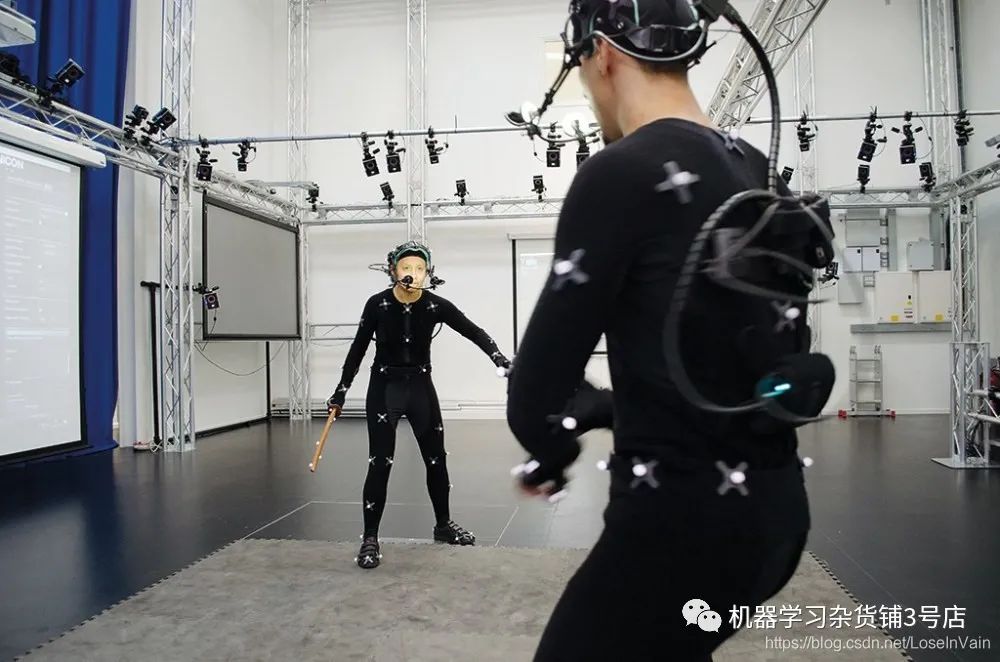 Fig 1.1 人体佩戴着能够反射特定红外激光的光标,周围部署多个特定的红外激光摄像机。