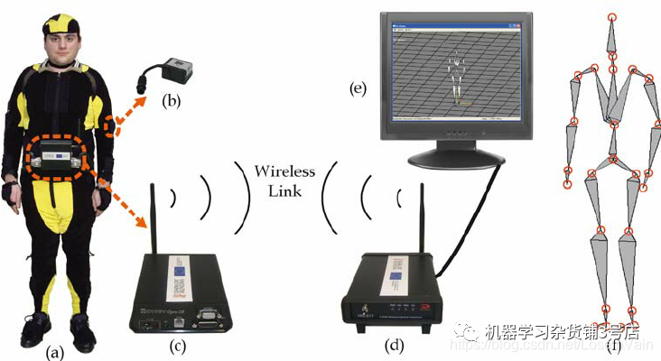 主动形式的人体动捕技术需要人体佩戴特定传感器,这些传感器或可以自己发射特定的激光信息到周围部署的摄像头,实现多目定位,或可以通过牛顿力学原理计算初始位置记起的每个时刻的空间位置状态(我们称之为惯性导航),如Fig 1.3所示,该类型的方案通常比 被动形式的方案要精准,但是要求人体佩戴更为昂贵的专用设备,因此场景还是受限于大规模的影视游戏制作上。(虽然基于IMU的设备通常比红外激光设备要便宜,但是精度不如基于光学定位的,而且容易受到环境磁场的干扰)