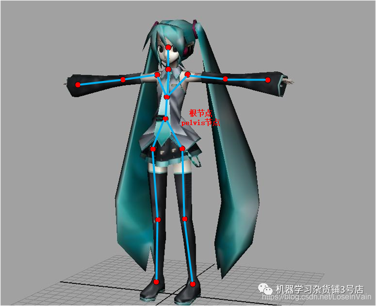 Fig 2.1 虚拟形象 初音未来 的Tpose模型,如果给虚拟模型绑定关节点,关节点的移动和旋转会带着蒙皮跟随变化。