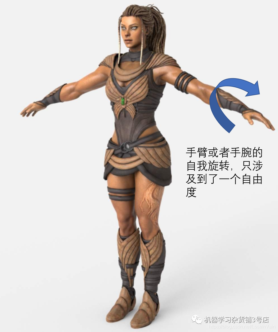 即便采用了反向动力学[9]去计算每个关节的旋转,但是某些关节(特别是双臂,双腿等可以自我旋转的)的“自旋转”是无法描述的,比如Fig 2.3所示,我们的中间输入是3D人体姿态,无法表述这种自旋转,因此即便采用了IK,计算得到的旋转角也会缺少一个自由度。当然,这个也并不是完全不能解决,如果姿态估计的结果能够精确到手指,给出部分手指的关节点数据,那么通过IK的约束还是可以恢复出手臂的自旋转的自由度的。