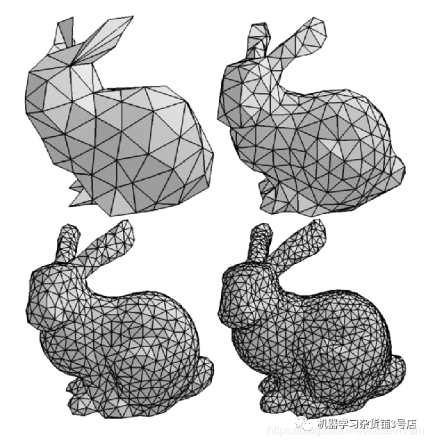 Fig 3.1 不同分辨率的兔子模型的3D mesh。