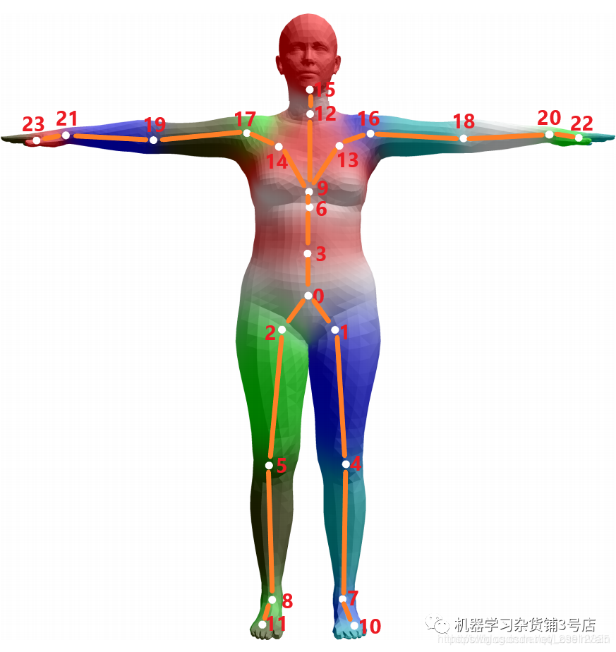 Fig 3.2 SMPL模型定义的24个关节点及其位置。
