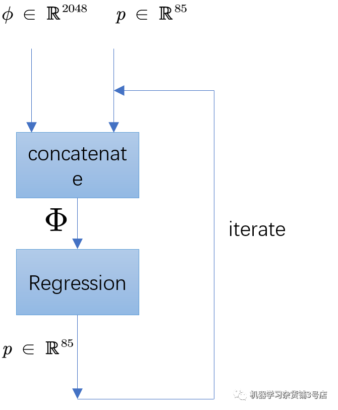 为了更好地回归出SMPL模型参数,不能直接一次性地用网络回归出这些参数,而是通过迭代(iteration)的方式进行逐步的优化的。具体来说,如图Fig 3.5所示,首先初始化一个SMPL参数,和特征输出进行拼接后,得到回归输入特征。通过两层的全连接网络作为回归器,回归出SMPL模型参数并将其反馈给输入前端,继续拼接并且循环刚才的过程。一般迭代次数设置。