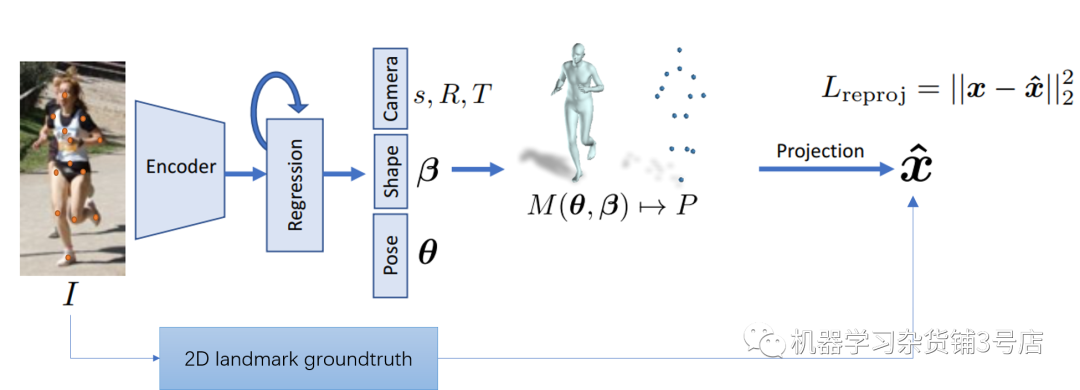 考虑到训练数据标注的多样性并且以2D标注为主,一般考虑用重投影(reprojection)得到的2D关节点作为预测进行损失计算。整个流程框图变成如Fig 3.8所示。