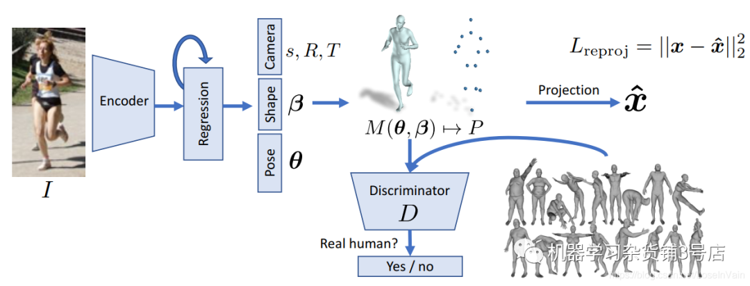 Fig 3.10 在HMR模型中,作者通过在大规模的真实人体mesh数据上进行对抗学习,从而引入了人体姿态正则。