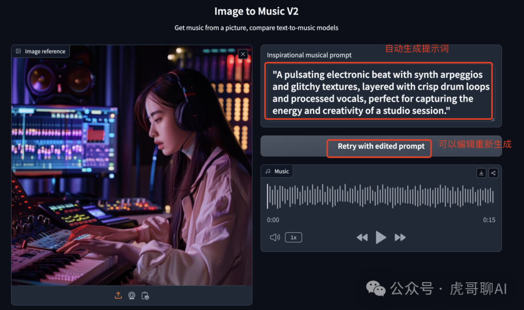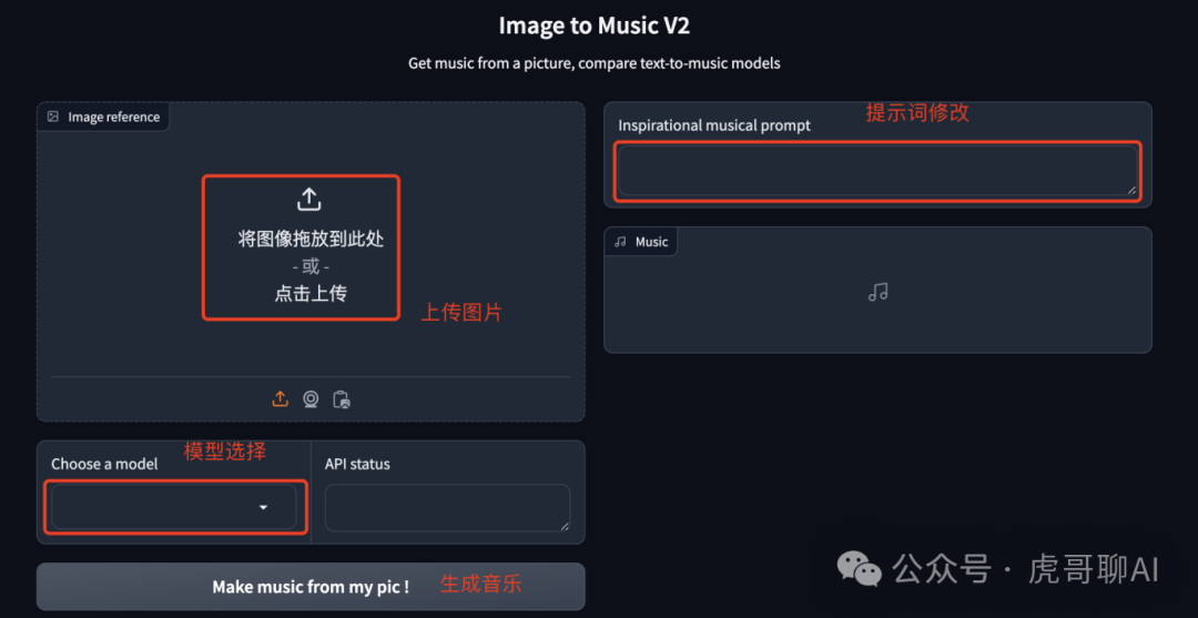 使用Image to Music非常简单:上传图片,选择音乐模型,系统自动生成音乐。无论是风景、人物还是动物图片,都能得到与之匹配的旋律。