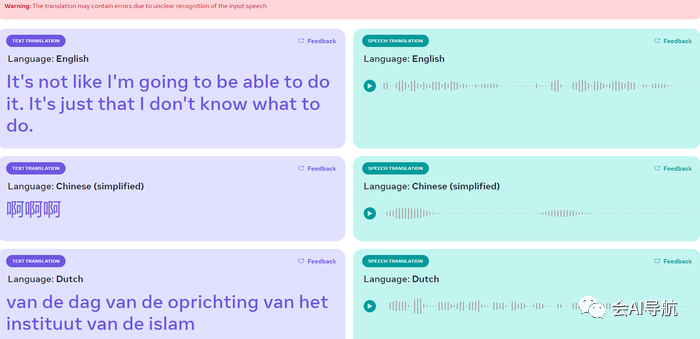 然而,该演示并非没有缺陷,Meta 指出它可能会生成不准确的翻译或改变您所说的单词的含义。正如您在上面所看到的,当输入谈论视频游戏“我们之中”时,结果有很大不同——从用英语谈论喇叭到用荷兰语谈论阿联酋的形成。