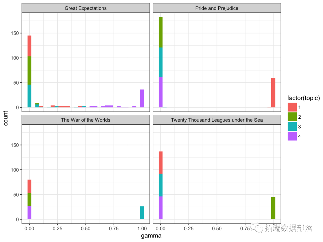 另请注意,LDA()不会为每个主题分配任何标签。它们只是主题1,2,3和4. 我们可以推断这些与每本书有关,但它仅仅是我们的推论。