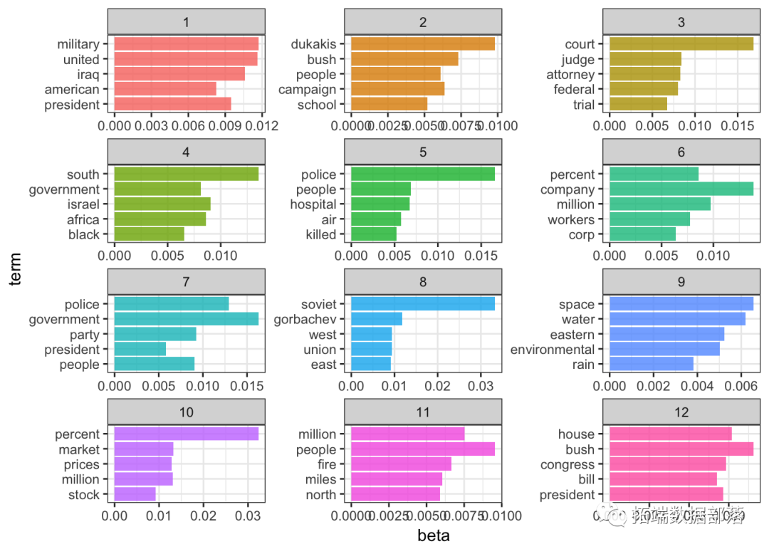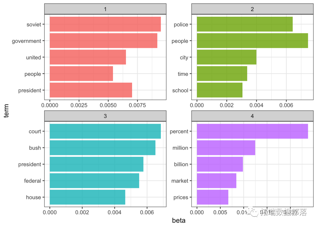 group_by(topic) %>%top_n(5, beta) %>%ungroup() %>%arrange(topic, -beta)top_terms## # A tibble: 20 × 3## topic term beta## <int> <chr> <dbl>## 1 1 soviet 0.009502197## 2 1 government 0.009198486## 3 1 president 0.007046753## 4 1 united 0.006507324## 5 1 people 0.005402784## 6 2 people 0.007454587## 7 2 police 0.006433472## 8 2 city 0.003996852## 9 2 time 0.003369658## 10 2 school 0.003058213## 11 3 court 0.006850723## 12 3 bush 0.006510244## 13 3 president 0.005777216## 14 3 federal 0.005512805## 15 3 house 0.004657550## 16 4 percent 0.023766679## 17 4 million 0.012489935## 18 4 billion 0.009864418## 19 4 market 0.008402463## 20 4 prices 0.006693626top_terms %>%) +coord_flip()