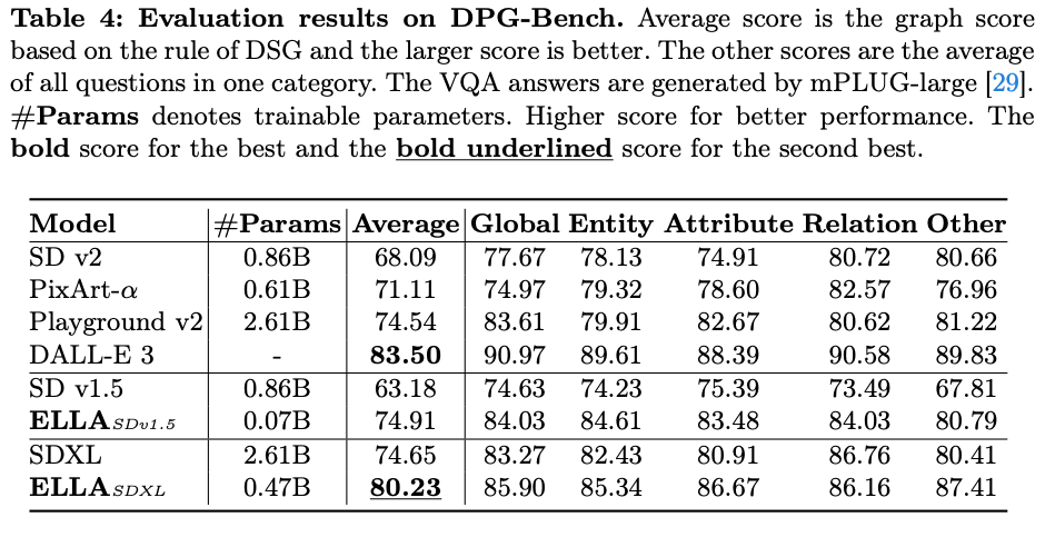 DPG-Bench 的评估结果。平均分数是基于 DSG 规则的图形分数,分数越大越好。其他分数是同一类别中所有问题的平均值。VQA 答案由 mPLUG-large 生成。#Params 表示可训练参数。分数越高表示性能越好。加粗的分数代表最佳,加粗并划线的分数代表第二佳。