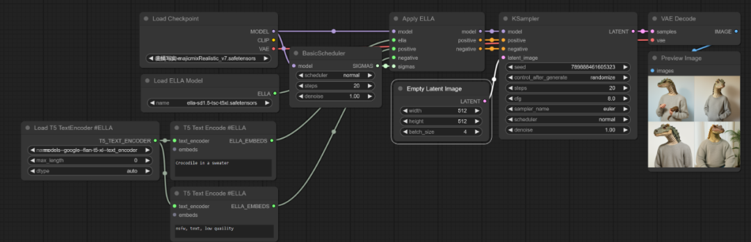• 下载对应模型:1:模型ella-sd1.5-tsc-t5xl.safetensors放置到ComfyUI/models/ella/目录下。2:模型models--google--flan-t5-xl--text_encoder放置到ComfyUI/models/ella_encoder/目录下。模型可以通过文末网盘获取或在线链接下载。