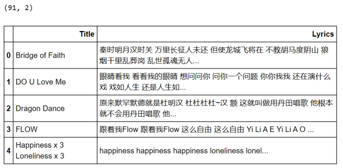 为了清楚地看清数据内容,下面代码用于将前5条Lyrics列的文本信息打印出来。